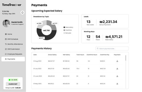 We focused on the employee interface, detailing primary and secondary functions such as work schedules, shift submissions, leave requests, upcoming salary and more.